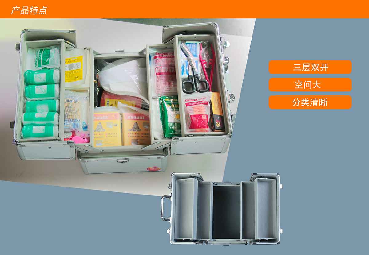 长沙旭尧高新技术开发有限公司综合急救箱,独特的箱体设计,适用于劳保、厂矿、公共场所、办公室、车间、学校、社区、健身房、实验室、建筑工地等人员密集的场所及防灾减灾等领域。